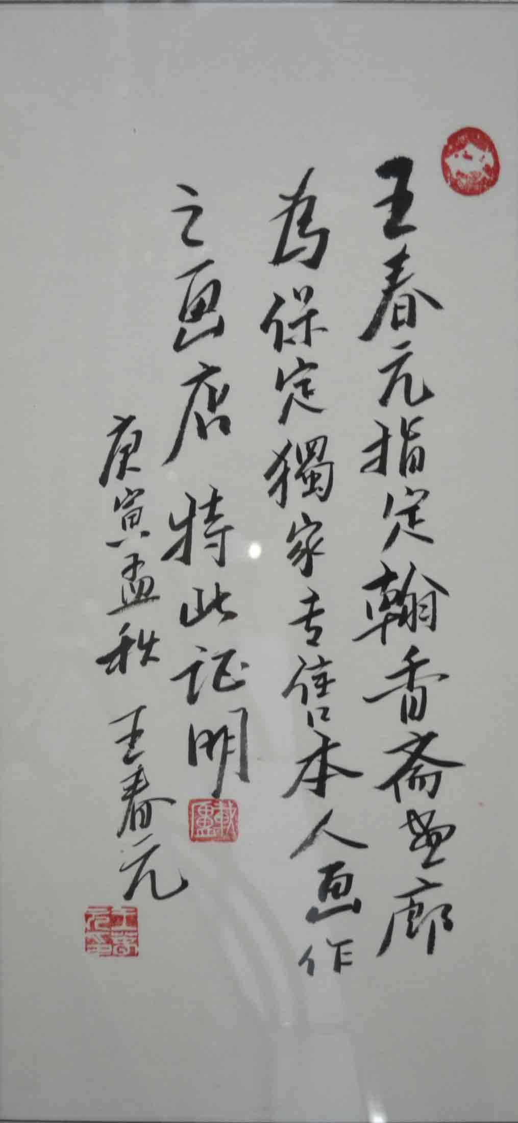 翰香斋画廊位于保定市朝阳大街的图书大厦三楼南厅,这里是保定市的繁华闹市区。该画廊创办于2004年,面积近200平方米,是具有较大规模的专业画廊,经营着几百位书画名家的作品,作品销往全国各地。